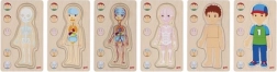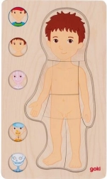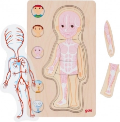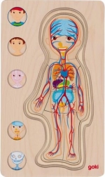 Le puzzle en bois Corps humain – garçon est un outil idéal pour les enfants curieux qui veulent voir sous la surface. Les cinq couches montrent progressivement la peau, les muscles, les organes internes, la circulation sanguine et le squelette. Chaque couche retirée révèle une nouvelle partie du corps et nourrit le désir naturel d’apprendre.