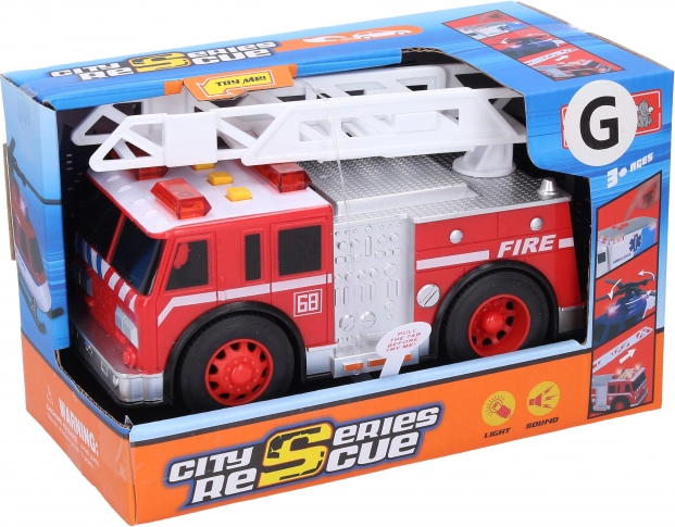 Camion de pompiers 18 cm avec effets lumineux et sonores, roues libres et échelle extensible. Idéal pour des missions de sauvetage d’enfants et un jeu créatif.