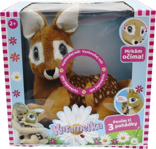 Karamelka te raconte 3 contes (Cendrillon, La Princesse aux cheveux d’or et Les trois ours, Raiponce). Karamelka cligne aussi des yeux. Taille : 36 cm.
