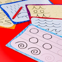 Le coffret comprend 18 tableaux sur lesquels on peut écrire et dessiner à l’aide d’un stylo ergonomique unique, inclus dans l’ensemble.