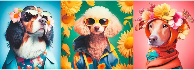Découvrez l’univers ludique du défilé de mode canin aux couleurs vives dans un format panoramique saisissant. Des chiens stylés, vêtus avec des lunettes de soleil et des fleurs, transforment l’assemblage en un moment de plaisir, et l’image finie devient une décoration originale.