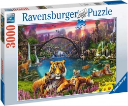 La boîte du puzzle présente une scène de tigres dans un paysage éclatant, riche en verdure et en animaux sauvages.