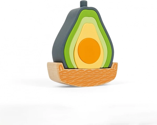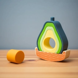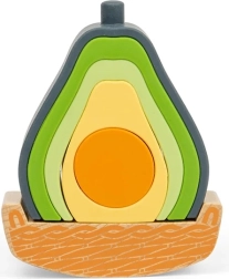 Un set de jeu en forme d’avocat qui associe bois et silicone de qualité alimentaire pour un apprentissage sûr et ludique. Les enfants peuvent empiler, trier les pièces et faire basculer l’avocat sur une base en bois. Les cinq éléments en silicone sont souples, résistants et parfaits comme jouet sensoriel. Les matériaux sont non toxiques, le silicone est lavable au lave-vaisselle et les pièces en bois sont certifiées FSC.