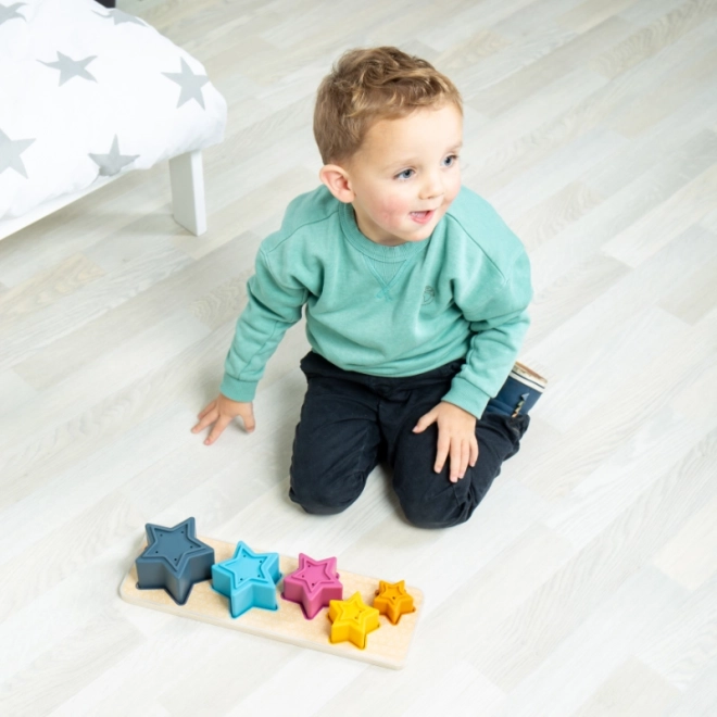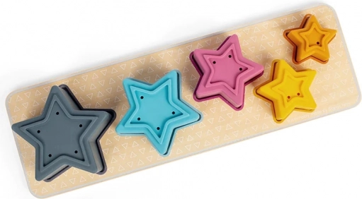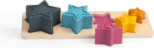 Découvrez le ludique puzzle à encastrer en forme d’étoiles combinant bois FSC et silicone, qui développe chez les enfants la motricité fine, la reconnaissance des couleurs et des tailles, et s’utilise aussi dans le bain grâce à l’effet fontaine des étoiles percées.