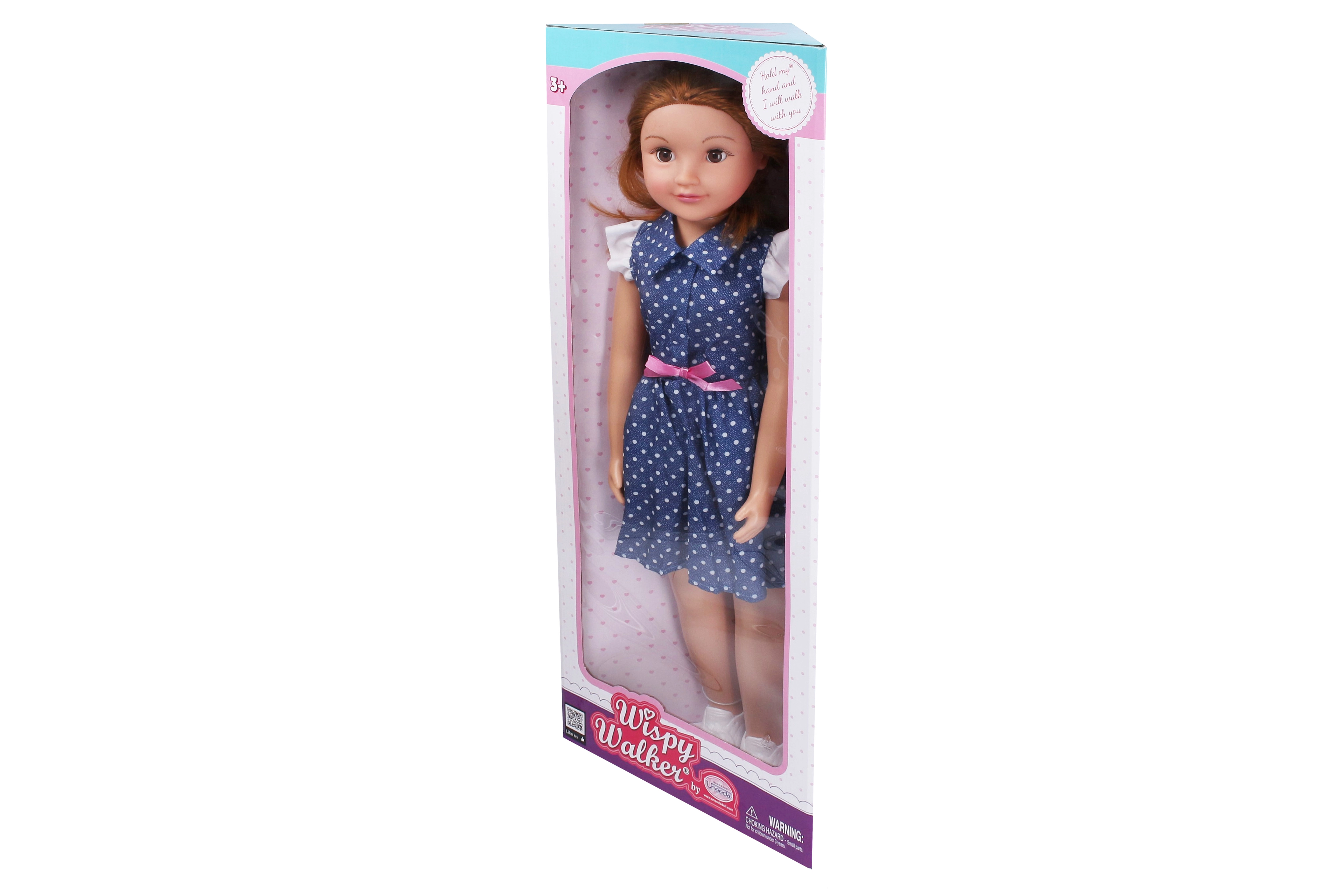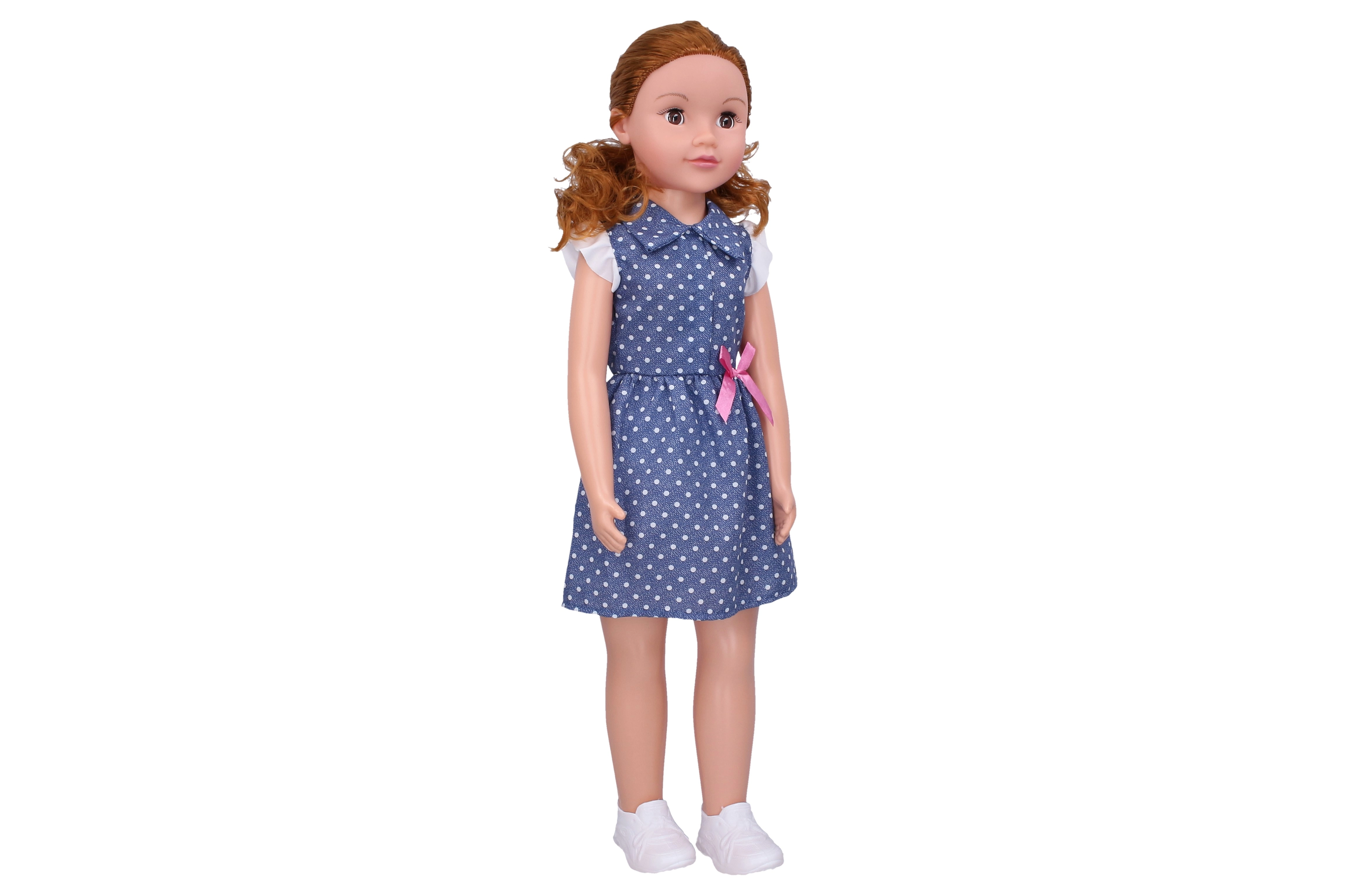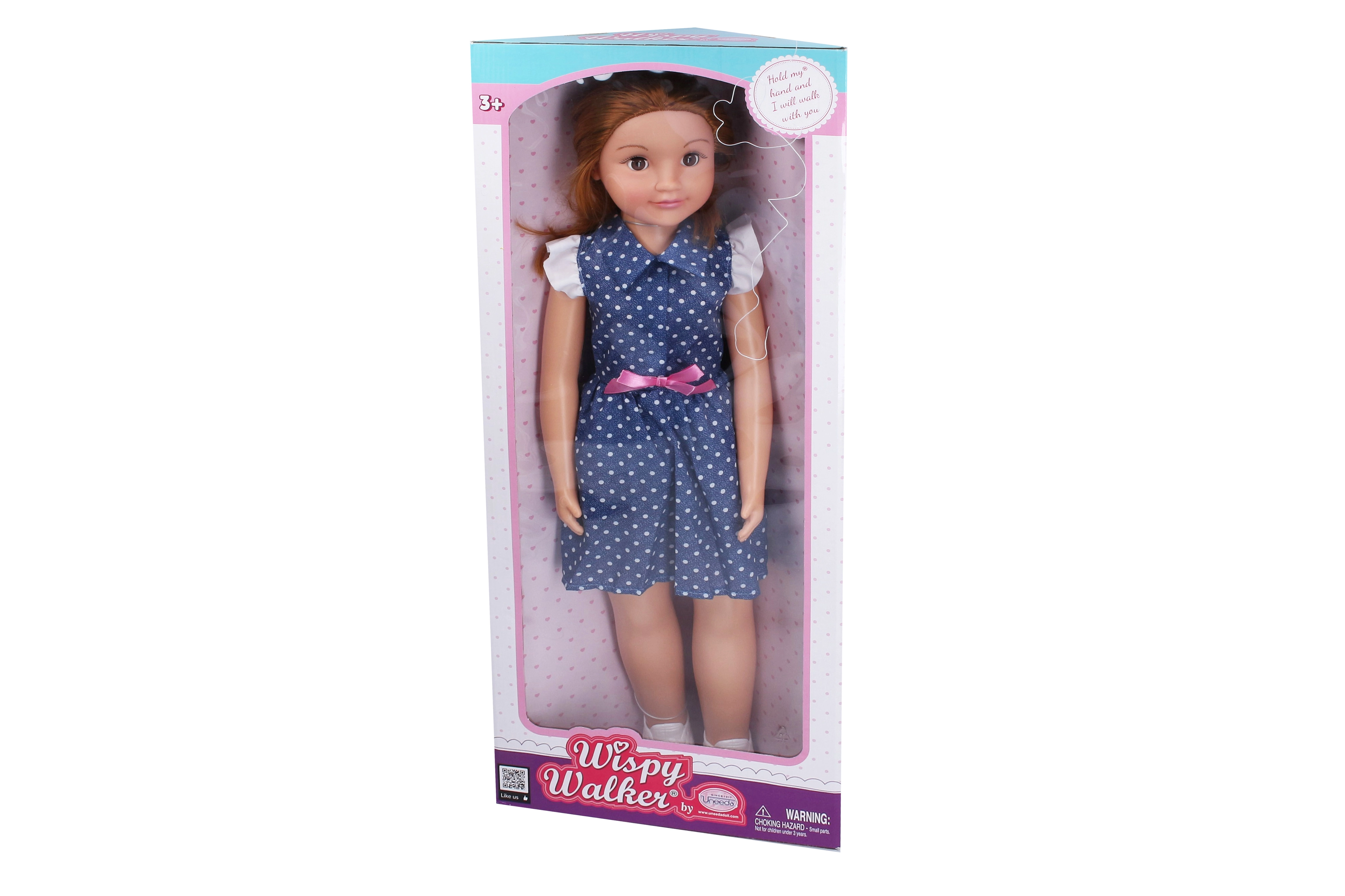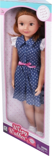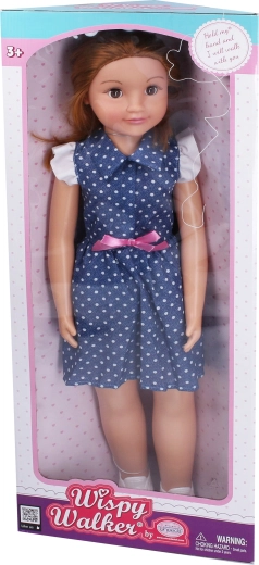Cette élégante poupée marcheuse en robe bleue à pois avec nœud rose ravira chaque enfant. Avec sa hauteur de 70 cm, elle paraît réaliste, se laisse facilement conduire par la main et fait des pas fidèles en marchant. Ses yeux dormeurs et ses cheveux détaillés lui confèrent le charme d’une véritable amie.
