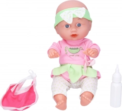 Un adorable bébé avec poussette, idéal pour le jeu des enfants et la découverte du monde imaginaire. L'emballage comprend une poussette pliable, un bavoir et un biberon pour une expérience de jeu complète.