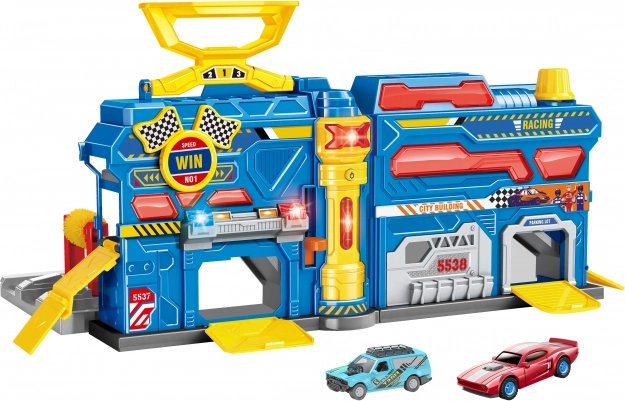 Station de course portable 55 × 20 × 25 cm avec effets lumineux et sonores. 2 voitures, panneaux, autocollants et piles 3× AG13 inclus. Montage facile.