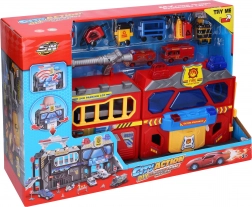 Les dimensions de la station 56 × 18 × 23 cm offrent un espace de jeu suffisant tout en restant facile à transporter. La boîte contient des panneaux de signalisation, un extincteur, une station de lavage, une station-service, une zone de diagnostic et d’autres éléments pour un service complet des pompiers.
