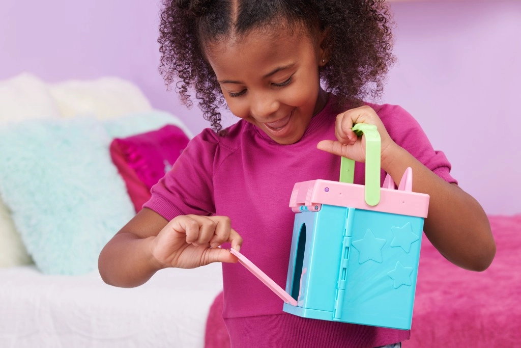 Montez par l’échelle de corde jusqu’au studio photo, sélectionnez l’un des quatre décors, installez le trépied avec l’appareil et créez la scène parfaite. Il y a aussi une boîte surprise : en scannant le QR code dans l’application gratuite La Maison magique de Gabby (iOS/Android), vous débloquez une récompense numérique spéciale.