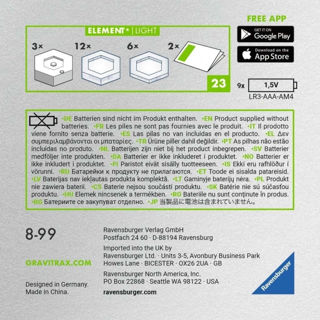 Étendez votre univers de billes GRAVITRAX avec des effets lumineux spectaculaires. Le set Light ajoute 3 colonnes lumineuses avec choix de couleur (rouge, vert, bleu, blanc) ou transition fluide des couleurs. Grâce aux éléments de rehausse transparents, construisez facilement des circuits multi-niveaux et enrichissez chaque parcours d’une expérience visuelle attrayante.