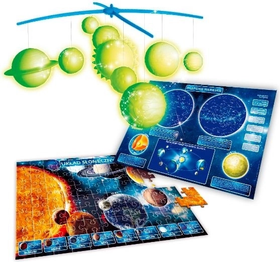 Le coffret inclut un bras de suspension pour exposer facilement le modèle dans la chambre, un poster grand format des constellations pour s’orienter dans le ciel nocturne et un puzzle du système solaire qui stimule la pensée logique et la mémoire. Un guide pas à pas clair permet même aux débutants de réussir le montage.