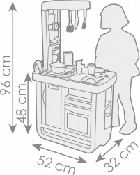 Elle est disponible dans des tons pastels doux qui s'harmonisent harmonieusement avec n'importe quel intérieur. Les parents et les enfants apprécieront certainement l'équipement riche de la cuisine, comprenant une cuisinière à 2 plaques, un four avec portes ouvrables, un réfrigérateur, un évier avec robinet et une cafetière. Le module sonore électronique souligne la réalité du jeu avec des sons de cuisson, ce qui procure encore plus de plaisir aux enfants.