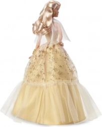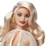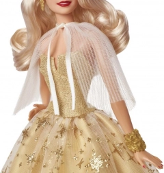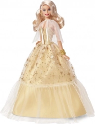L'édition de vacances Barbie 2023 est confectionnée pour ceux qui veulent ajouter un éclat à leur collection ou surprendre quelqu'un avec un cadeau exceptionnel. La poupée arbore des cheveux blonds platine en vagues glamour, une robe champagne décorée d'étoiles dorées et un manteau plissé transparent. Tout est parfaitement assorti à ses boucles d'oreilles et bracelet dorés.