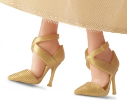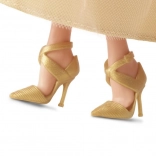 La robe élégante est complétée par des boucles d'oreilles et un bracelet dorés, complétant le look festif total de la poupée.