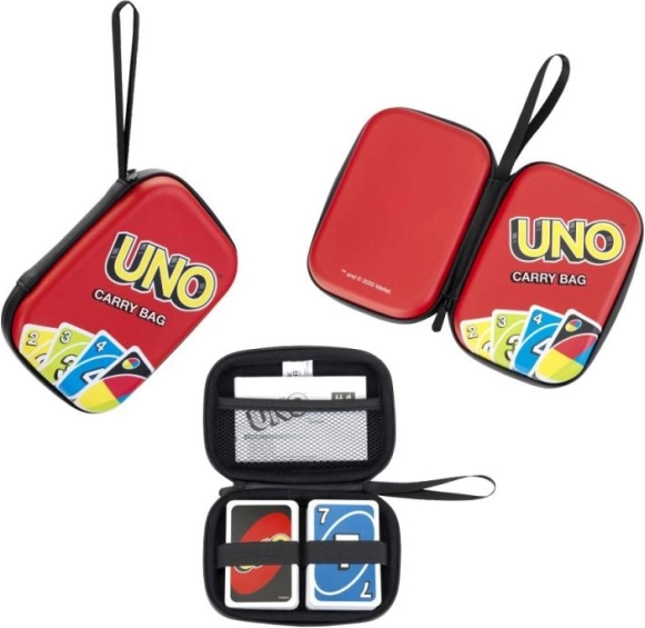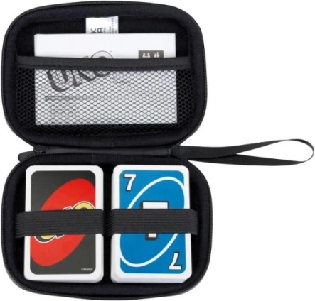 L'étui de voyage comprend une poche en maille interne pour le manuel UNO et deux élastiques internes pour sécuriser les cartes.
