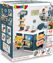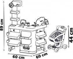 Supermarché avec caisse, rayon fruits/légumes, balance (nouvelle balance mécanique : le poids affiché s’ajuste en fonction des aliments pesés). L’enfant peut régler l’horloge et le panneau ouvert/fermé. Contient 42 accessoires : pâtes, biscuits, céréales, lait, 6 pièces de fruits et légumes, 1 gâteau, 2 macarons, 2 boîtes de conserve, 1 lecteur de codes-barres électronique avec son et lumière, 1 carte de crédit, 4 tickets de caisse, 9 pièces et 12 billets. La caisse possède un tiroir-caisse, un micro et un lecteur de cartes de crédit. Chariot inclus.