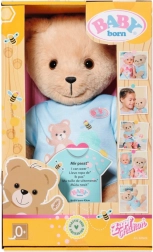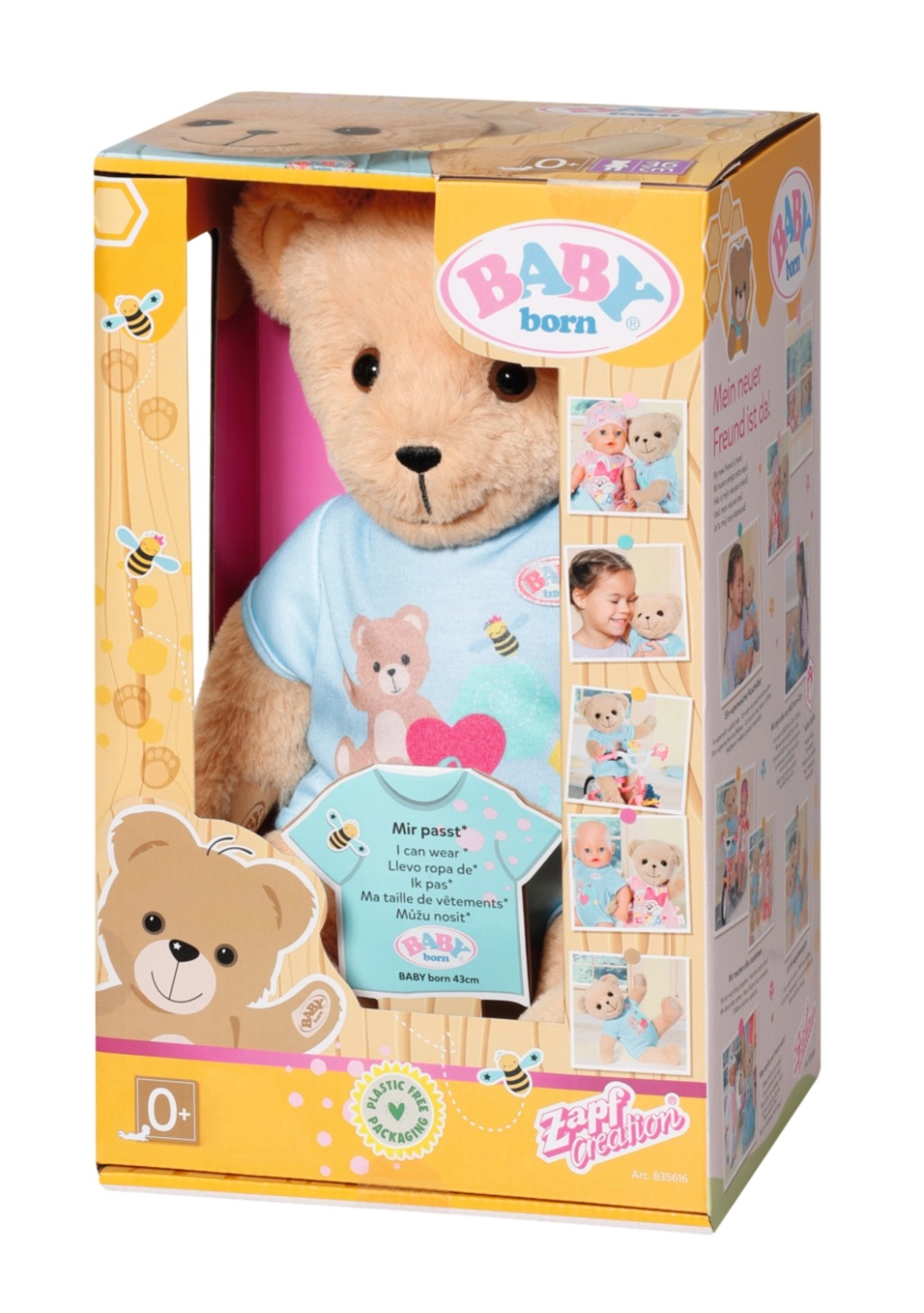 Adorable ourson BABY born, compagnon doux pour les câlins et le jeu, conçu pour compléter à merveille l’univers des poupées BABY born 43 cm. Il possède un corps souple, des bras et jambes articulés ainsi qu’une tête rotative pour faciliter l’habillage. Il peut porter presque tous les vêtements et accessoires BABY born (sauf les chaussures) et inclut un livre d’amitié avec autocollants.