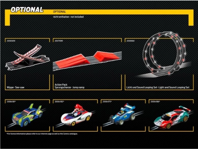 - Lignes droites, virages, virages relevés, mur vertical, 2× looping, supports, glissières, rails de guidage