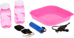 Le coffret comprend une batterie 3,7 V, un câble USB, 2× solution, un bol, une lanière et des autocollants – tout pour jouer immédiatement.