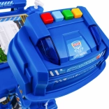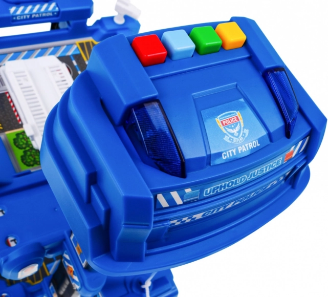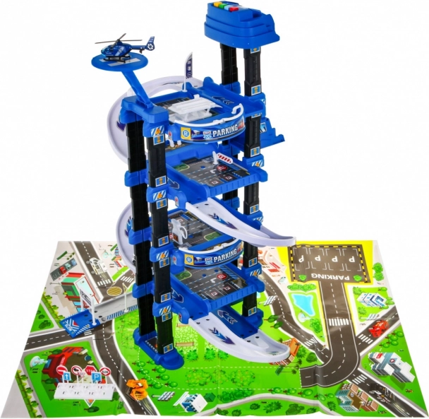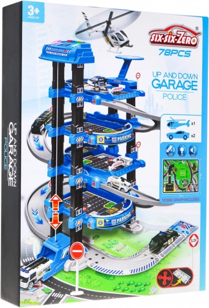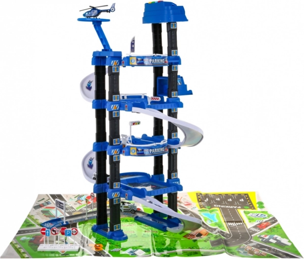 Grand parking de police à plusieurs niveaux avec ascenseur et tapis, offrant des heures de jeu créatif aux enfants dès 3 ans. Cinq étages avec rampes, un ascenseur avec lumières et sons, une aire d’atterrissage pour hélicoptère et de nombreux accessoires stimulent l’imagination et la motricité fine. Inclus : 2 petites voitures, un hélicoptère, des panneaux de signalisation et un grand tapis de jeu avec des rues.