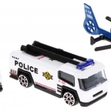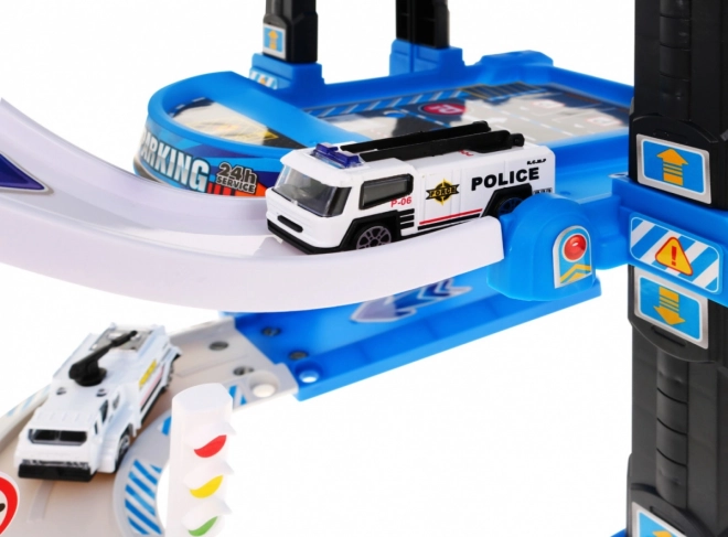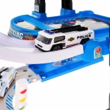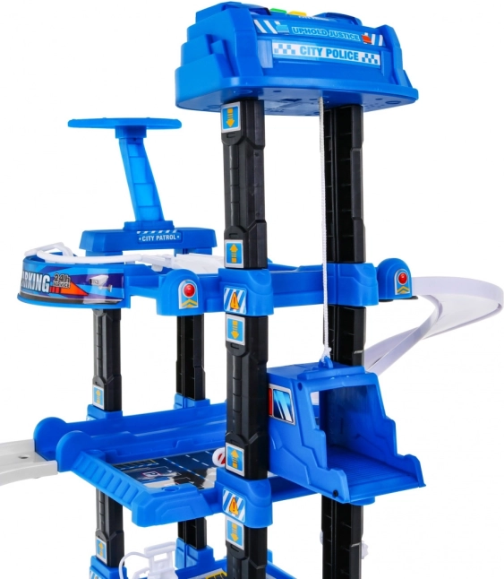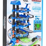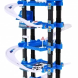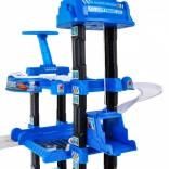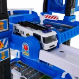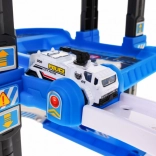 Ce robuste garage de police à plusieurs niveaux combine descente ludique sur les rampes et ascenseur fonctionnel, qui monte et descend avec lumières clignotantes et effets sonores (alimentation 3× AA, non incluses). Au niveau supérieur se trouve un héliport, les niveaux inférieurs offrent des places de stationnement et des passages.