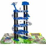 La construction à plusieurs étages propose des trajets entre les niveaux, des places de stationnement et une zone d’atterrissage pour hélicoptère. Idéal pour un jeu dynamique et créatif.