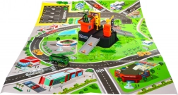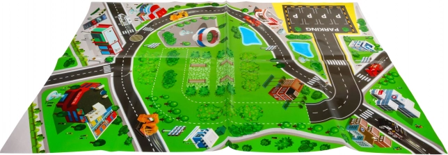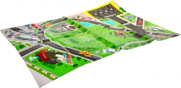 Le tapis d’environ 78 × 58 cm représente des rues, des parkings et des bâtiments – idéal pour apprendre les bases des situations de circulation.