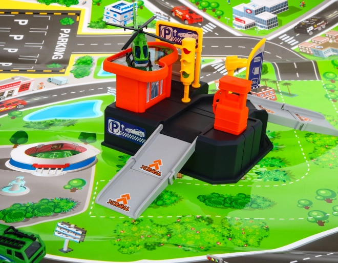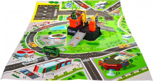 Ce set coloré en plastique transforme la chambre en petit centre de circulation. Le parking à deux niveaux avec rampes et héliport est complété par un tapis avec ville et routes, sur lequel les enfants peuvent conduire la voiture et faire atterrir l’hélicoptère. Grâce à ses dimensions compactes, il trouve facilement sa place dans une chambre d’enfant et se range rapidement.