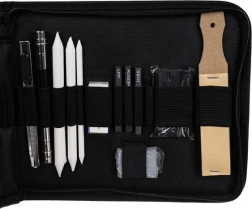 Ce set universel de dessin de 32 pièces combine différentes duretés de crayons (B, HB, H), des fusains gainés de bois et en bâtons et des bâtons de graphite pour obtenir des lignes fines, des ombres profondes et des dégradés tonaux fluides. Le tout est rangé de manière claire dans un étui zippé robuste avec dragonne, qui protège les outils et facilite le transport.