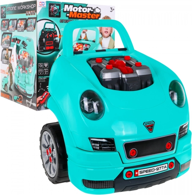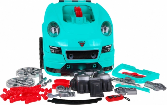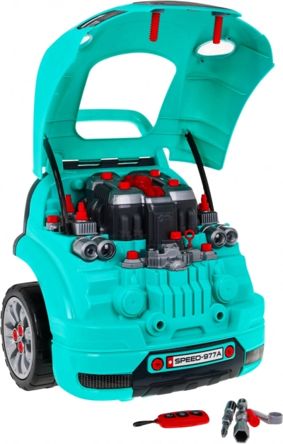 Ce set complet de « petit mécanicien » propose l’avant d’une voiture avec un moteur richement équipé à monter et démonter, un tableau de bord fonctionnel avec bouton de démarrage, un volant avec klaxon et signal d’alerte. Les enfants peuvent « entretenir » bougies, roues et pièces du moteur, tandis que les lumières et les sons se contrôlent via la télécommande fournie.