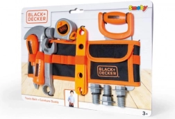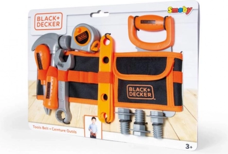 Ceinture à outils avec sangle réglable sous licence Black & Decker. Comprend 14 accessoires : scie, tournevis, marteau, clé mixte, mètre, 3 vis, 3 plaques plates et 3 écrous. Avec poche de rangement. Dimensions : 44 x 10 x 6 cm.