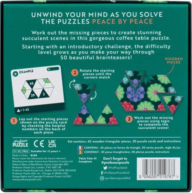 Détendez votre esprit avec le jeu de logique Peace by Peace : Succulentes, qui combine un beau design et des défis malins. Assemblez des images de succulentes à partir de triangles en bois, progressez à travers 50 missions et entraînez votre imagination ainsi que votre concentration. Contient 45 pièces triangulaires en bois, 50 cartes d’instructions et des modèles uniques pour divertir enfants et adultes.