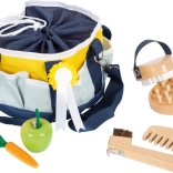 Ce kit de qualité pour le jeu d’imitation permet aux enfants de s’occuper de leur cheval préféré comme de vrais palefreniers. Le sac avec large ouverture à cordon garde tous les accessoires bien rangés, tandis que les poches latérales assurent visibilité et accès rapide. Le pack inclut des outils en bois pour brosser, peigner et nettoyer les sabots, plus un ruban de tournoi pour une touche festive.