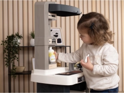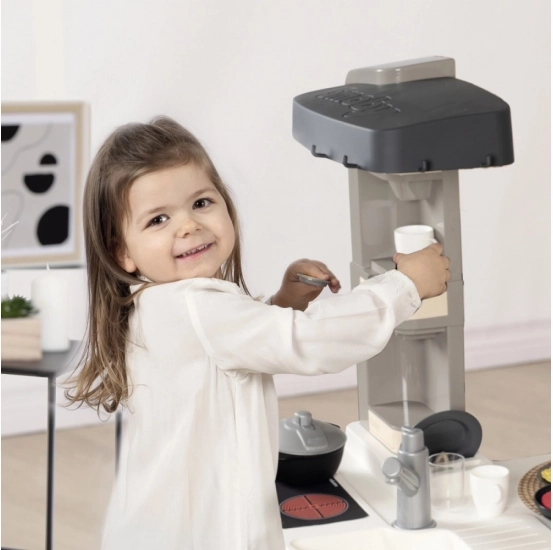 La cuisine électronique Smoby mini Tefal Studio est équipée d’effets sonores qui renforcent le réalisme du jeu. Elle comprend une cuisinière avec plaques, une hotte, un four, un réfrigérateur, une machine à café à capsules, un appareil à soda et une poêle.