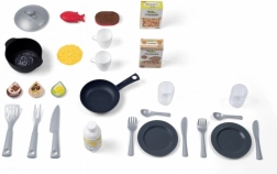 Parmi les autres éléments, on trouve un évier avec robinet et 27 accessoires, tels que des couverts, des assiettes, des gobelets et des espaces de rangement, assurant l’ordre pendant le jeu. Des fonctions spéciales incluent de la viande et du poisson au design réversible, paraissant crus d’un côté et grillés de l’autre, ainsi que des pâtes magiques qui semblent prêtes à déguster.