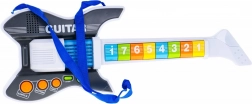 | Fonctions | - bouton marche/arrêt, - le bouton stop arrête la musique, - le bouton « sample » joue 8 morceaux de démonstration, - le bouton « rhythm » joue 8 rythmes de guitare, - le bouton « tone » propose 3 sons de guitare différents, - les boutons 1,7,6,5,4,3,2,1 servent à jouer, - des lumières colorées sur la guitare clignotent pendant le jeu, - la sangle peut être passée sur l’épaule. |
