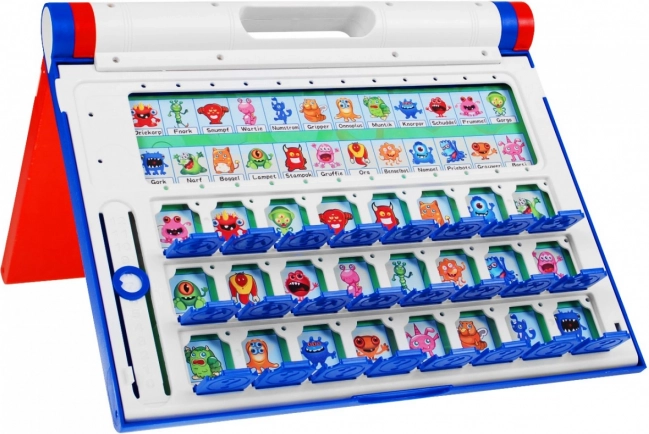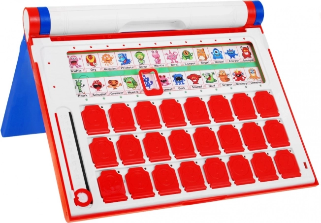 Console rouge et bleue claire pour 2 joueurs avec rangées de personnages et curseur de score 0–12. Ouvrez et fermez facilement les volets et éliminez les personnages étape par étape.