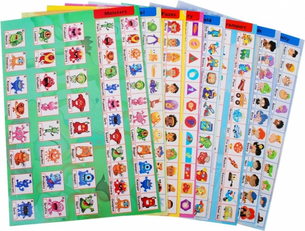 Cartes illustrées avec catégories (visages, formes, transports, famille, monstres) favorisant le développement du vocabulaire, de l’attention et de la capacité à créer des associations.