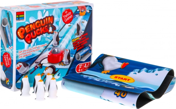 - tapis de jeu antidérapant, 5 manchots, 6 palets avec bille en métal, guide