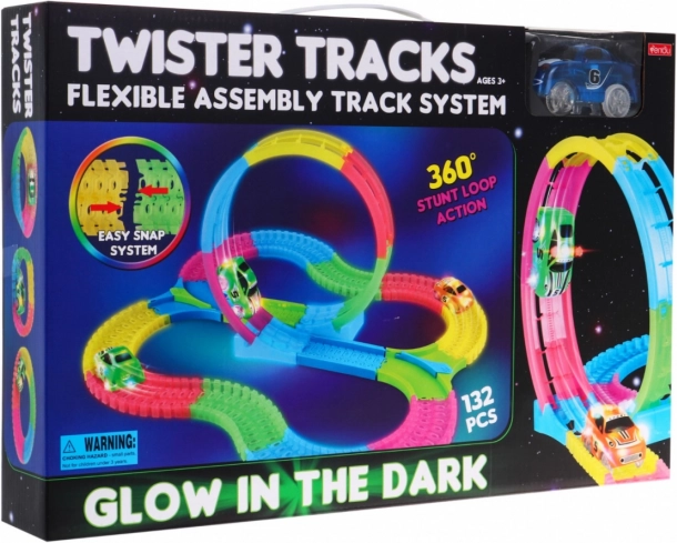Piste de course lumineuse avec loopings et voiture LED pour enfants dès 3 ans. Effet fluorescent, montage facile, stimulation de la créativité.