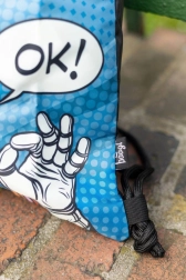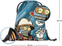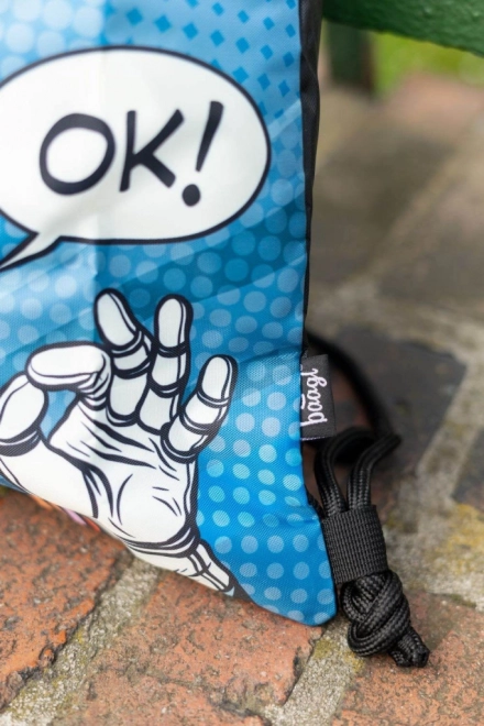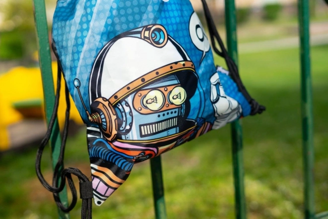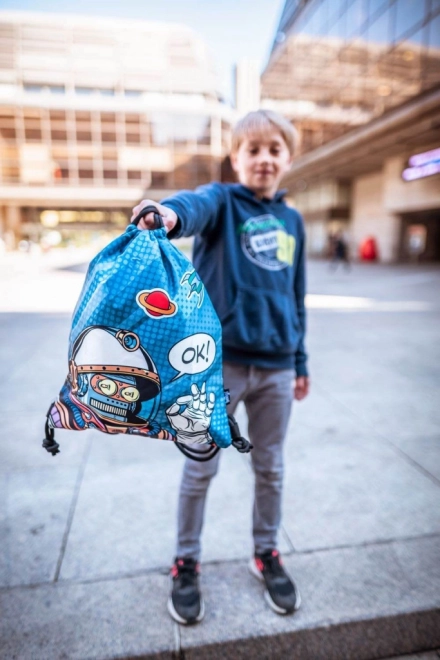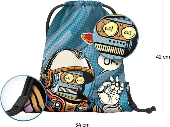 Le design avec un robot et une bulle de texte 'OK!' confère au sac une apparence unique pour les enfants.