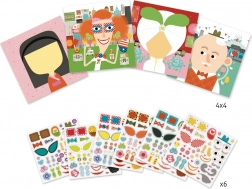 - 16 feuilles avec modèles de visages, 240 autocollants repositionnables (yeux, nez, bouches, lunettes, moustaches, boucles d’oreilles, etc.)