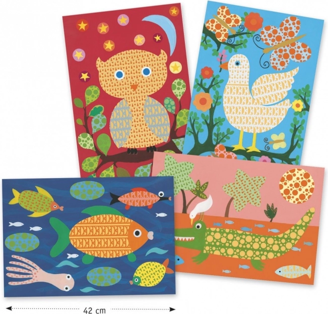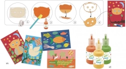 - 4 images avec fonds variés, 8 planches de parties d’animaux, 3 flacons de peinture (rouge, jaune, vert), 3 bandes pochoir, une planche de pastilles adhésives, un applicateur avec éponge