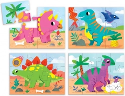 Le coffret Mudpuppy Dinosaures 4 en 1 propose quatre puzzles différents avec des illustrations joyeuses de dinosaures par Kathryn Selbert. Chaque puzzle a un niveau de difficulté distinct (4, 6, 9 et 12 pièces), idéal pour développer progressivement la motricité fine, la patience et la logique des enfants dès 2 ans.