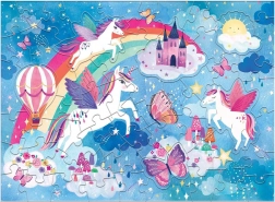 Une illustration colorée avec des licornes, un arc-en-ciel et des papillons invite à l’assemblage et stimule l’imagination ainsi que la patience.