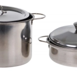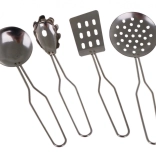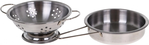 | - grande casserole avec couvercle, - petite casserole avec couvercle, - passoire, - poêle, - spatule pour frire, - louche, - écumoire, - cuillère à pâtes, - petite assiette. | |