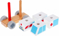 Cette ambulance en bois est idéale pour les premiers jeux de construction et de motricité. Les enfants enfilent quatre blocs sur deux tiges fixées à la base et assemblent leur propre véhicule avec des symboles familiers des services de secours. Des roues souples permettent de rouler en douceur sur le sol, favorisant l’imagination et les jeux de rôle de sauveteur.