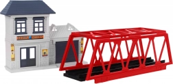 Le set comprend des locomotives, des wagons, une gare, un pont et des éléments décoratifs comme des arbres ou des panneaux de signalisation. Ce jouet offre une expérience interactive et créative pour les enfants et les parents.