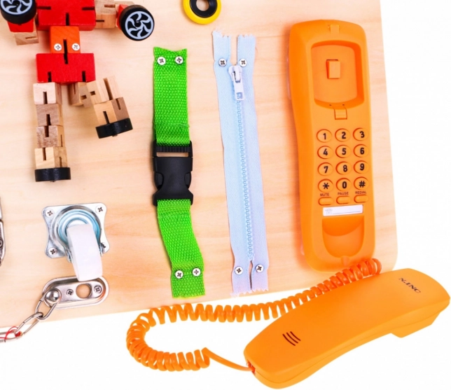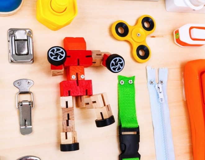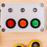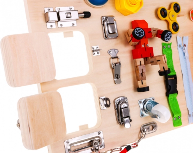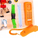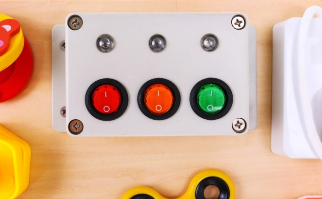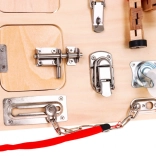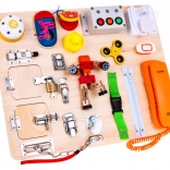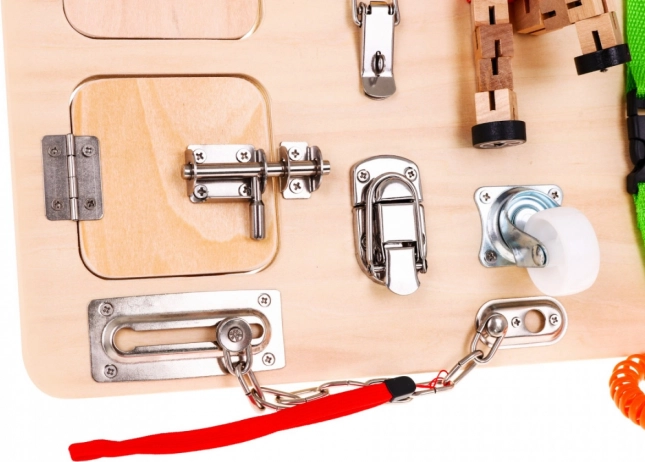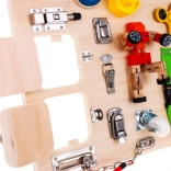 Le tableau comprend de nombreux éléments interactifs tels que des serrures, des interrupteurs et des mécanismes de retour qui favorisent l’amélioration de la motricité fine et l’apprentissage des relations de cause à effet.
