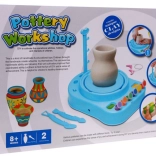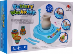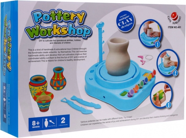 | | Le kit du petit potier est un jouet éducatif pour fabriquer et peindre des récipients en céramique. Les enfants peuvent créer leurs propres pots, tasses ou carafes puis les décorer avec des couleurs selon leurs envies. Le tour de potier tourne à deux vitesses, lente et rapide. Le jouet stimule l’imagination et développe la dextérité, ainsi que les compétences manuelles et artistiques. Convient aux enfants à partir de 8 ans et certifié CE. Alimentation par piles 3 x R14 (non incluses). | Contenu du kit |